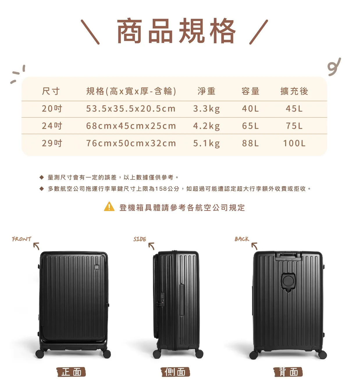 | 尺寸(吋) | 規格(高x寬x厚-含輪) | 重量 | 容量 | 擴充後 | 是否需要登機 | 參考建議 |